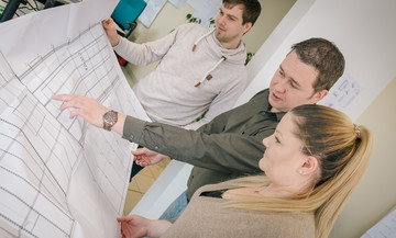 Das Bild zeigt Frau Steigerwaldt (rechts) zusammen mit Ihren Kollegen Dr. Thomas Kirsch (Mitte) und Thomas Tombrägel (links) bei der Besprechung einer neuen Planungsaufgabe.